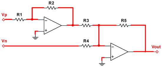 After setting the circuit parameters, they need to be downloaded to the development board. The specific method is as follows: First, the main configuration AHF composed of system1_ic and system2_ic is downloaded to the development board, and then the dynamic configuration AHF file composed of system1 and system2 is downloaded as well. During this process, no additional operations are required, and the wiring and jumper caps on the development board must remain unchanged. Figure 21 is the FPAA framework diagram. The FPAA needs to be connected according to the architecture diagram. Since the FPAA outputs differential signals, an external subtractor is needed to output the correct waveform. Figure 22 is the phase trajectory diagram of the chaotic system actually output by the FPAA. It should be noted that, due to different oscilloscope sampling rates, sampling times, and other parameters, the output phase trajectory diagrams may also differ. The simulation parameter values can be appropriately adjusted according to the actual situation to solve this issue. Since the FPAA outputs a differential signal, it needs to pass through the subtracter to output the correct signal. Its circuit structure is shown in Figure 23. Ports 21 of system1 and system2 need to be connected to the Vp port of the subtracter, and all ports 22 need to be connected to the Vn port of the subtracter. In the circuit schematic diagram, the model of the operational amplifier is LM741. The circuit element paraments are selected as follows: R1 = R2 = R3 = R4 = R5 = 10 kΩ.