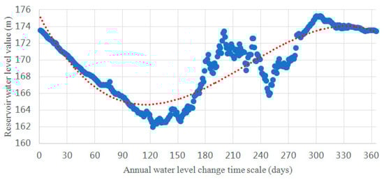 The deterministic coefficient of fitting is R2 = 0.8047, which shows that the polynomial fitting method can better fit the annual water level changes in the Three Gorges Reservoir area. The water level fitting polynomial can be obtained as follows: