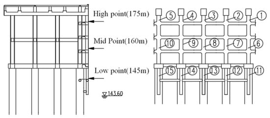 In order to distinguish different components in the subsequent calculation process, we numbered the load-bearing structure of the wharf: 1–11. The magnitude and longi-tudinal position of ship impact are applied according to the values determined above, and the specific position is shown in Figure 4.