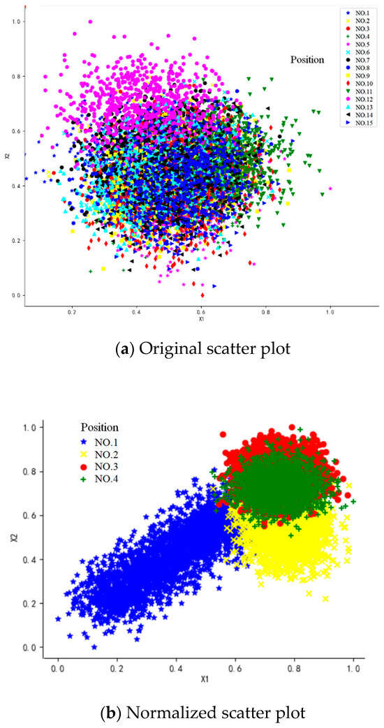 The first two characteristics of each group of samples are taken as the horizontal axis and the vertical axis to draw the scatter diagram, as shown in Figure 5, which shows the original scatter diagram and normalized scatter diagram of pile foundation stress under ship collision.