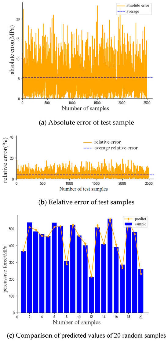 It can be seen from Figure 9 that some samples in the test set have large errors, reaching about 20 kN, most of which are within 10 kN, and the average relative error is about 3%. The performance of the model is relatively excellent and can meet the demand of inversion analysis of the inducement of ship impact damage.