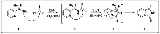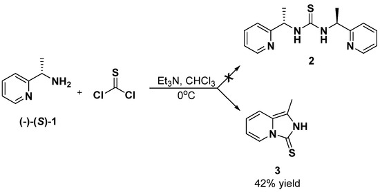 Our experiments began with an attempt to synthesize symmetric thiourea 2, a derivative of enantiomerically pure (S)-1-(2-pyridyl)-ethylamine 1. We planned to obtain it from the reaction of thiophosgene with two molar equivalents of an optically active amine 1 in the presence of two equivalents of triethylamine. Unfortunately, the experiments carried out in chloroform solution at 0 °C did not provide the expected thiourea 2. A spectroscopic analysis of the purified reaction product, isolated in 42% yield, showed a heterocyclic structure similar to derivative 3 (1-methyl-2H,3H-imidazo [1,5-a]pirydyne-3-tione—already described in the chemical literature) [39] (Scheme 1).
