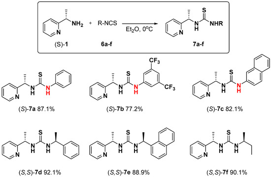 However, a series of unsymmetrical thioureas, 7a–f, containing enantiomerically pure (S)-1-(2-pyridyl)-ethylamine 1 in their structure were obtained as expected in the reaction of this pyridylamine enantiomer with corresponding isothiocyanates 6, which were commercially available (phenylisothiocyanate 6a, 1-isothiocyano-3,5-bis (trifluoromethyl) benzene 6b and naphthyl-1-isothiocyanate 6c) or obtained according to the procedure described in the literature [40], with appropriate amines using carbon disulfide and DCC (N,N’-dicyclohexylcarbodiimide)-[(1S)-1-isothiocyanoethyl)-benzene 6d, 1-[(1S)-1-isothiocyanoethyl) naphthalene 6e and (2S)-2-isothiocyanatobutane 6f (Scheme 3). All reactions carried out in diethyl ether at 0 °C provided thioureas 7a–f in good yields (77.2–92.1%) after chromatographic purification of the crude reaction products.