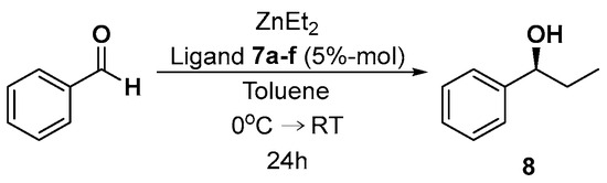 The chiral catalysts, 7a–f (0.1 mmol), were placed in a round bottom flask and dissolved in toluene (5 mL). After cooling the reaction mixture to 0 °C, a solution of diethylzinc (3.0 mL, 3 mmol, C = 1M in hexane) was added under argon. After 30 min, benzaldehyde (0.1 mL, 1.0 mmol) was added. The resulting solution was stirred at room temperature for 24 h. After completion of the reaction, 5% aqueous HCl (10 mL) was added, the layers formed were separated, and the aqueous layer was extracted with Et2O (4 × 10 mL). The combined organic layers were dried over anhydrous MgSO4. The drying agent was removed by filtration and the filtrate was concentrated on an evaporator. The crude product 8 was purified using column chromatography (Hexane: EtOAc 20:1 → 5:1). 1 H NMR (200 MHz, CDCl3) δ 0.90 (t, 3H, J = 7.4 Hz), 1.68–1.86 (m, 2H), 2.04 (br s, 1H), 4.57 (dd, 1H, J = 6.5 Hz), 7.24–7.36 (m, 5H). The enantiomeric excess (ee) was determined by HPLC using a chiral packed column: Lux 5µ Cellulose-1 (Phenomenex), Hexane: iPrOH 70:30, tR1 = 4.9 min, t R2 = 8.6 min. Details of all experiments are summarized in Table 1.