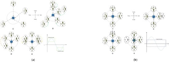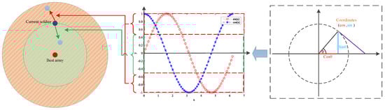 where rand is a random constant in the range of [0, 1]. To speed up the convergence rate, a trigonometric function (including sine and cosine functions) is added to disturb the soldiers’ migration position. Since the trigonometric function changes in both positive and negative directions in the range, it promotes the diversity of soldiers in location migration and avoids local stagnation. The right of Figure 4 shows the wave pattern of trigonometric functions. As shown in Figure 4, the effects of the sine and cosine functions with the range in [−1, 1] illustrate the direction of the soldier’s migration location, whether away from or near the current best army. This mechanism ensures that the BCA explores and exploits a significant amount of search space. The parameters are implemented with Equations (8) and (9).