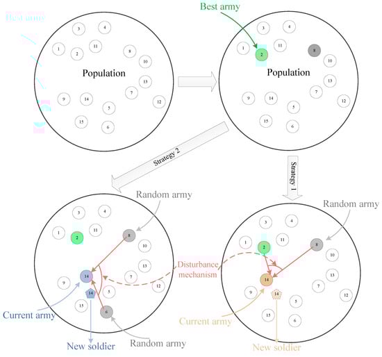 Adopting which besiege or conquer mechanism is decided by the relationship between rand and BCB. The allocation of the besiege and conquer mechanisms to update the soldiers’ positions are shown in Figure 5. The design of the balance mechanism is conducive to achieving an equilibrium between exploration and exploitation capabilities. The selection of different strategies can help find the global optimal solution. Meanwhile, there is an 80% probability to further update the position of the soldiers with the best army, and a remaining 20% probability of using random soldiers as benchmarks to approach the soldiers. The two different strategies complement each other and can help avoid local stagnation and accelerate convergence. Equation (10) shows how to choose the approach strategy to attack the enemy in different circumstances. The practical cooperation of the two strategies can promote the capability of global search and increase its effectiveness in finding the optimal solution.