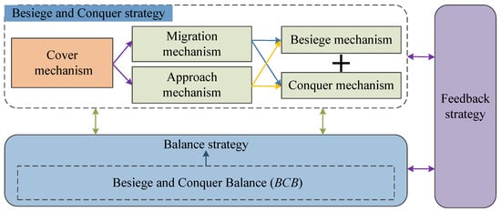 In the BCA, the parameter BCB is adjusted dynamically according to the distance between the current army and the best army to effectively achieve a balance between exploration and exploitation capabilities. BCB is used for balancing the behavior between besiege and conquer, that is, exploration and exploitation. According to the Pareto Principle [], the parameter BCB is initially set to 0.8. BCB controls both the exploration and the exploitation capabilities. A higher value of BCB enhances a powerful local search and convergence speed, while a lower value of BCB results in slow convergence but a powerful global search. In other words, the BCA’s exploration and exploitation capabilities are controlled by the BCB. The BCB in Equation (4) controls the approach strategy of soldiers, which influences the exploration ability and convergence speed. By adjusting the parameter of BCB through the feedback mechanism, the speed of finding the optimal solution can be accelerated. The BCA contains mechanisms that complement each other, and the relationship between these mechanisms is shown in Figure 6.