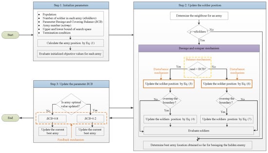 Approach mechanism. Improving the diversity of global search to effectively balance exploration and exploitation, Equation (4) is adopted to generate new soldiers to facilitate the search for optimal solutions. This soldier position focuses on the best army and the current army, promoting soldiers to achieve the best army and speeding up convergence capability. It reaches a nearby position of the best army by the parameter Besiege and Conquer Balance (BCB).