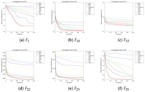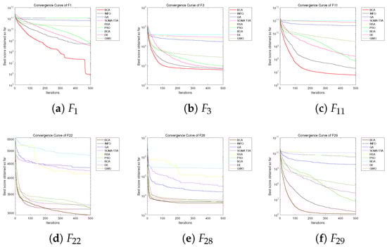 The performance of the proposed algorithm and its superiority compared to other algorithms are verified by comparison with classical, popular, and recent algorithms, such as INFO [], RSA [], SOMA T3A [], BOA [], GWO [], DE [], GA [], and PSO []. The selected algorithms are introduced in detail as follows. These algorithms represent a variety of optimization approaches, such as EAs, SI, and DE, which have been widely applied to similar optimization problems. By comparing with these algorithms, we aim to demonstrate the effectiveness and efficiency of our method across different optimization paradigms.