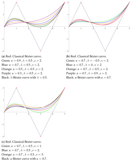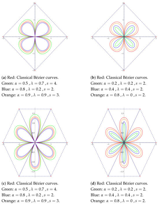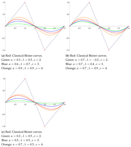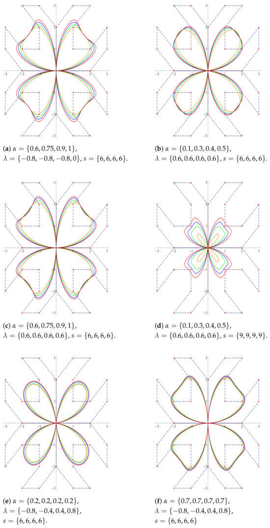 Figure 6 are drawn using the classical Bernstein polynomial bases. As evident from the graphs, variations in the parameters allow the curves to shift closer to or farther from the control points in comparison to the classical one.