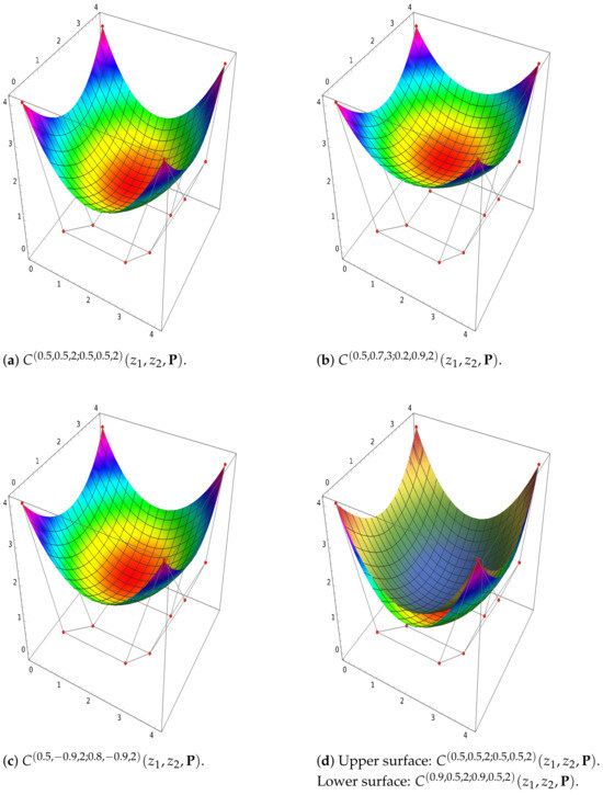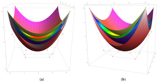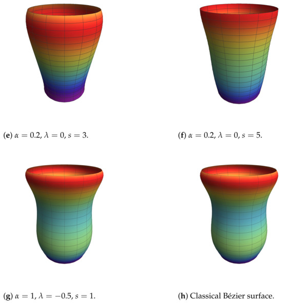 Reducibility: By Remark 1, for and , we obtain the classical tensor product Bézier surfaces.