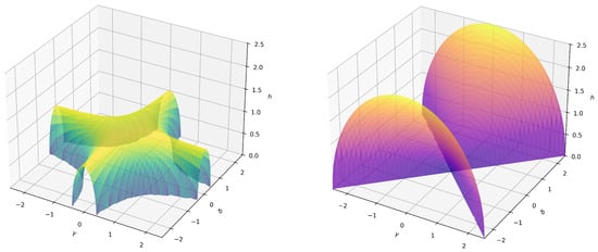 The general approach of our analysis is as follows: we first select a plane in the (, , h)-space by imposing a constraint on the model parameters. The QPT lines are then identified as the intersections of the phase boundaries, defined by Equations (4) and (5), with the chosen plane. Next, we perform a sudden quench of one or more model parameters, focusing on the asymptotic limit where the charging time approaches infinity, and finally, we plot the energy stored per dimer in the battery as a function of the pre-quench parameter. In the asymptotic regime we are studying, the energy stored in the QB assumes the form [].