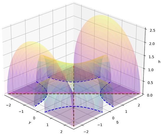 These equations represent the phase boundaries of the model, whose plots are reported in Figure 1. In [], it has been shown that the charging process at zero external field shows signatures of the presence of the QPT lines of the model. Those lines can be obtained by setting in Equations (4) and (5), as shown by the blue and red dashed lines in Figure 2, respectively. The Figure also shows a very interesting and intricated phase diagram at finite h.