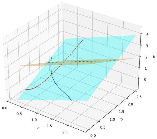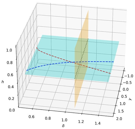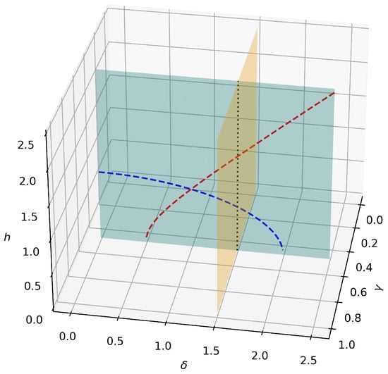 Section of the phase diagram of the model. The cyan and orange planes have equations and , respectively, while the black dotted line is given by the intersection of the aforementioned planes; this is the line where the quench takes place. The blue and red dashed lines are the QPT lines given by the intersection of the boundaries reported in Equations (4) and (5) with the plane.