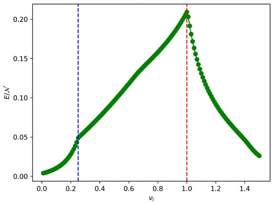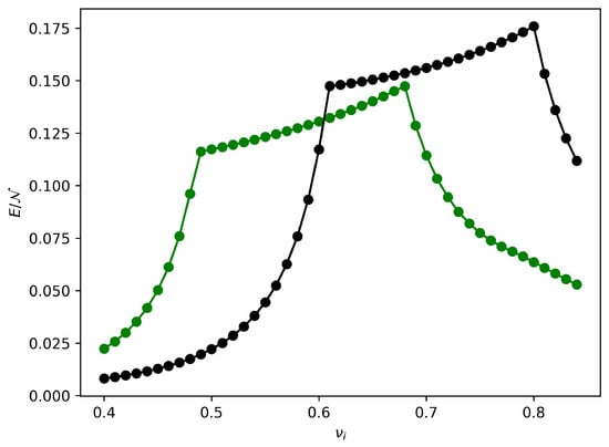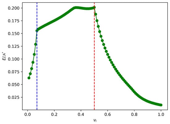 As in the previous case, Figure 6 shows the energy stored per dimer as a function of , with fixed at . The observed trend is very similar to the one shown in Figure 4, with an initial rising until the first QPT line, an almost-linear rise until the second one, and then a decrease.