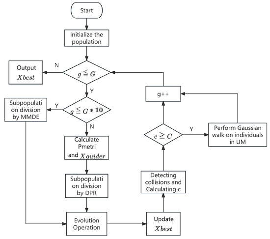 However, when the algorithm just enters the evolutionary stage, the update times of individuals are all 0; then, the above sub-population division strategy cannot be implemented. Therefore, in order to avoid this problem, before the number of iterations of the algorithm is less than 10% of the maximum number of iterations, we use the sub-population division strategy in MMDE [21] for the population, which is based on the fitness and the Euclidean distance between the individual and the optimal individual, which avoids the above problem.