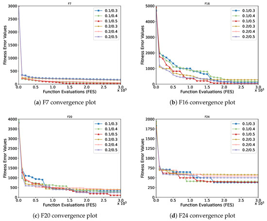 Since this paper uses the collision frequency (determined by the initial/final value according to the formula) as a condition for triggering the restart strategy, we will further calculate the impact of different thresholds on the performance of the algorithm. In this paper, we select four representative benchmark functions in the CEC2017 test set for experiments, single-objective function F7, multi-peak function F16, combined function F20 and F24 and set six groups of different collision frequency threshold parameters 0.1/0.3, 0.1/0.4, 0.1/0.5, 0.2/0.3, 0.2/0.4 and 0.2/0.5. Figure 2 shows the six groups of convergence plots for different parameters for the above four benchmark functions (D = 30). In Figure 2a, the optimal solution obtained by the 0.1/0.5 parameter is the smallest, while the six groups of parameters perform roughly the same in terms of function convergence; in Figure 2b, the 0.2/0.5 parameter has the fastest convergence, the 0.1/0.5 parameter jumps out of the local optimum the most and the 0.1/0.3 and 0.1/0.4 parameters jump out of the local optimum in a good way; in Figure 2c, the initial value of the of 0.2 parameter has the fastest convergence, but the change of fitness is less obvious in the later stage, and the three sets of parameters with initial value of 0.1 have the most obvious effect of jumping out of the local optimum, especially 0.1/0.5; in Figure 2d, the three sets of parameters with initial value of 0.2 basically fail to jump out of the local optimum in the later stage in the fast convergence, and the change of fitness in the first and middle stages of the 0.1/0.5 parameters is most significant.