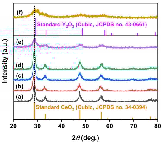XRD was utilized to investigate the impact of the incorporation of Y elements on the phase composition and crystallographic structure of the samples. Figure 1a presents the XRD patterns of the samples synthesized without Y. All discernible diffraction peaks were consistent with the standard CeO2 pattern (Cubic, Fm–3m(225); JCPDS no. 34−0394), and no impurity phases, such as CeCO3 or CeCO3OH, were detected. For the sample synthesized with a 10 mol.% Y content (Figure 1b), the XRD diffraction peak was similar to that of the undoped CeO2 in Figure 1a, however, there was a slight but not negligible shift towards lower 2θ values. This shift might be attributed to the partial substitution of host Ce4+ (0.97 Å) ions by larger Y3+ (1.02 Å) ions and the resulting local lattice expansion of the CeO2 crystal structure. For the samples synthesized with 30 mol.% (Figure 1c) and 50 mol.% (Figure 1d) contents, their XRD diffraction peaks exhibited similar peak positions and shapes to those of the undoped CeO2 in Figure 1a, without any noticeable shifts. However, when the amount of Y increased to 70 mol.%, only four smooth diffraction peaks appeared in the XRD pattern of the obtained sample (Figure 1e). In contrast, when no Ce was added, only three smooth diffraction peaks with a lower intensity were observed in the XRD pattern of Figure 1f, and these could be matched with the three strong peaks characteristic of standard Y2O3 (Cubic, Fm–3m(225); JCPDS no.43–0661). This suggested that either a low crystallinity or amorphous substances were present in these obtained Y2O3 samples.