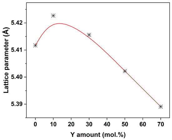 When impurity ions entered the lattice, they induced lattice distortion, which could be discerned by alterations in the lattice parameters to determine whether the lattice had expanded or contracted. In this work, the lattice parameters of the resulting cubic samples were determined based on Bragg’s equation, and the findings are presented in Figure 2. Specifically, the lattice parameter of undoped CeO2 (i.e., 0 mol.%) was measured at 5.4117 Å, while that of CeO2 doped with 10 mol.% Y was found to be slightly larger at 5.4227 Å. This observation aligns with the phenomenon depicted in Figure 1b, wherein a shift in the XRD diffraction peak towards lower 2θ values was evident for the doped sample compared to its undoped counterpart. The introduction of Y was shown to cause an expansion of the CeO2 lattice, indicating a significant influence on its structural properties. With the gradual addition of Y, the lattice parameters of the cubic samples decreased. When 70 mol.% of Y was added, the resulting sample showed a lattice parameter of 5.3891 Å, which closely approximated the theoretical lattice parameter of cubic Y2O3 (5.2644 Å).
