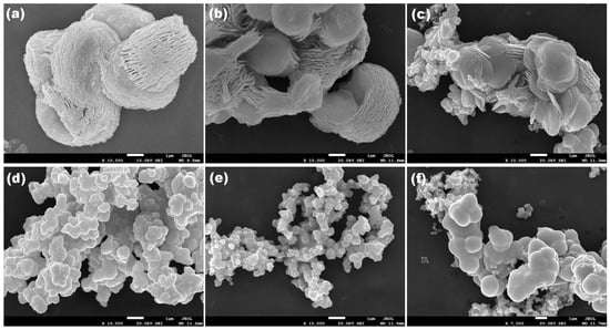 SEM analysis was undertaken to elucidate the morphological characteristics of the samples synthesized with varying dosages of Y. In the sample synthesized without Y, namely, the undoped cubic CeO2 (Figure 3a), the morphology exhibited a multilayered structure consisting of interwoven nanodisk sheets (20 nm) with a diameter of approximately 5 μm. Upon introducing 10 mol.% of Y (Figure 3b), the multilayered structure remained unchanged. However, with an increase to 30 mol.% of Y (Figure 3c), a new morphology emerged in the form of coral-like aggregate particles alongside the original multilayered structure. Subsequently, at a 50 mol.% addition of Y (Figure 3d), the multilayered structure was completely replaced by coral-like aggregate particles. Notably, as the Y content increased to 70 mol.% (Figure 3e), there was a reduction in the size observed for these coral-like aggregate particles. Conversely, in the sample synthesized without Ce, namely, cubic Y2O3 (Figure 3f), two distinct types of coral-like aggregates were identified, one large and one small in size. Based on the shifts of 2θ in Figure 1, the variation in lattice parameters in Figure 2, and the evolution of morphology in Figure 3, it can be concluded that the doping levels for Y within CeO2 were controlled within a range not exceeding 10 mol%.