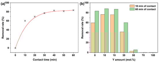 (a) Time dependence of AO7 removal rates in the presence of undoped CeO2 and (b) removal rates at 10 min and 60 min of contact onto the samples synthesized with different Y dosages, where 0 mol.% represents the reference sample synthesized without Y, namely, the undoped CeO2 sample, and 100 mol.% represents the reference sample synthesized without Ce, namely Y2O3.