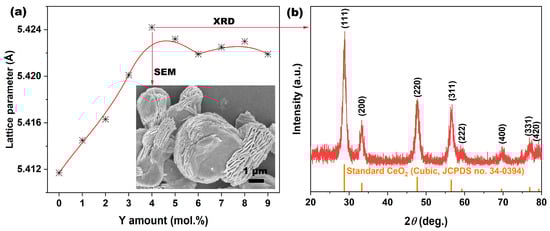 (a) Lattice parameters of doped CeO2 with different Y amounts of 1, 2, 3, 4, 5, 6, 7, 8, and 9 mol.% and (b) XRD pattern of the CeO2 synthesized with 4 mol.% Y (0 mol.% represents the reference sample synthesized without Y, namely, the undoped CeO2, and the inset in Figure 5a shows the SEM image of the CeO2 synthesized with 4 mol.% Y).