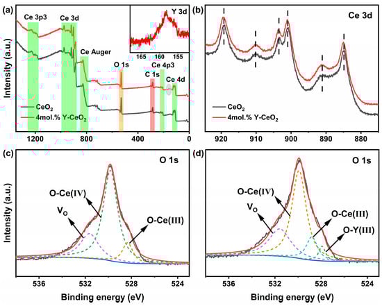 XPS analysis was utilized to examine the chemical composition and oxidation states of the CeO2 surface before and after Y doping, with the aim of gaining insight into any potential alterations. Figure 6a depicts the wide-scan XPS spectra of undoped and 4 mol.% Y-doped CeO2. All wide-scan XPS spectra exhibited distinct CeO2 features, as evidenced by the signals of Ce 3p3, Ce 3d, Ce Auger, Ce 4p3, Ce 4d, and O 1s, which were in excellent agreement with previously reported XPS patterns of both undoped and Y-doped CeO2 [22,23,24]. Notably, the prominent C 1s peaks observed at approximately 284.8 eV were attributed to adventitious carbon present for sample calibration purposes. Furthermore, a faint Y 3d signal was visible in the vertical ellipse, and the corresponding Y 3d XPS region is shown in the inset of Figure 6a. The presence of an Y 3d characteristic peak in the XPS spectrum strongly suggested the existence of Y(III) species within the lattice structure of CeO2. This finding provides compelling evidence for the incorporation of Y ions into this crystal framework, thereby enriching our understanding of the complex interplay between Y and Ce oxides at a molecular level. In order to investigate the chemical states of Ce in CeO2, the Ce 3d XPS core-level regions of undoped and 4 mol.% Y-doped CeO2 were recorded, as depicted in Figure 6b. Upon comparison with the Ce 3d XPS region of undoped CeO2, no significant alterations in peak shape and binding energy were discerned for the 4 mol.% Y-doped CeO2, suggesting that the Y doping had minimal impact on the Ce species in CeO2. To delve into the chemical states of O in CeO2, the O 1s XPS core-level regions of the undoped and 4 mol.% Y-doped CeO2 were recorded and fitted, as illustrated in Figure 6c and d. For undoped CeO2, its O 1s XPS region could be curve-fitted into three peaks. The peaks with binding energies of approximately 528.3 and 529.8 eV could be attributed to the lattice oxygen of O−Ce(III) and O−Ce(IV) species, respectively, while that at approximately 531.6 eV could be assigned to chemisorbed oxygen or/and weakly bonded oxygen species associated with VO defects. As for the 4 mol.% Y-doped CeO2, alongside the aforementioned three peaks (representing O−Ce(III), O−Ce(IV), and VO correlation), a new curve was fitted at around 527.9 eV, which might be ascribed to corresponding O−Y(III) species. Furthermore, the relative VO content could be approximated by determining the ratio of the integrated area of the peak associated with the VO defect to that of all peaks. The calculated value for 4 mol.% Y-doped CeO2 was found to be 27.2%, which was notably higher than that of undoped CeO2 at 13.4%. This implied that the incorporation of Y doping had a positive impact on the generation of VO in CeO2, suggesting an advantageous influence on its overall performance.