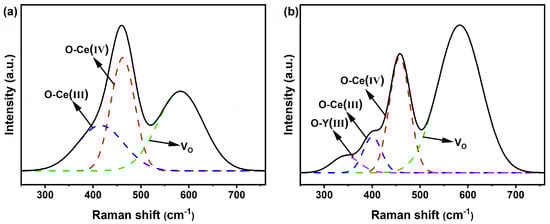 Raman scattering was utilized to explore the structural characteristics of the undoped and 4 mol.% Y-doped CeO2, owing to its sensitivity towards VO defects. This advanced technique allowed for a comprehensive investigation into the composition and arrangement of these materials, shedding light on their intricate properties. In Figure 7a, the Raman spectrum of undoped CeO2 is elegantly fitted into three distinct peaks. The peaks observed at Raman shifts of approximately 419.9 cm−1 and 463.7 cm−1 were confidently attributed to the lattice oxygen of O−Ce(III) and O−Ce(IV) bonds, respectively, while the peak at approximately 583.5 cm−1 was unequivocally assigned to the oxygen species associated with VO defects. In contrast, for the 4 mol.% Y-doped CeO2, in addition to three peaks corresponding to O−Ce(III), O−Ce(IV), and VO correlations, a novel curve emerged at around 346.4 cm–1, which was ascribed to the O–Y(III) bond. Upon comparison of the Raman spectra of the undoped and 4 mol.% Y-doped CeO2, it became evident that a significant transformation occurred in two peaks at 580 cm−1 and 460 cm−1. In the case of undoped CeO2, the dominant Raman peak belonged to the Ce species, whereas after Y doping, the Vo-related peak took precedence. This radical shift in peak dominance underscores the impact of Y doping on the Raman spectra of CeO2. Moreover, akin to the XPS analysis, the relative VO and O−Ce(III) contents were also estimated by determining the ratio of the integrated area of the peak associated with the VO defect or O−Ce(III) to that of all peaks, respectively. The calculated values for VO and O−Ce(III) in the 4 mol.% Y-doped CeO2 were determined to be 64.9% and 66.6%, which significantly exceeded those of undoped CeO2 at 25.0% and 32.1%. Additionally, the relative O−Y(III) content was approximated to be 4.6%. This suggests that undoped CeO2 inherently possesses a certain number of VO defects and Ce(III) species, while Y doping promotes the presence of more species.