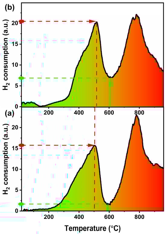 To more precisely ascertain the quantity of VO defects, H2 was employed as a reducing agent in H2−TPR apparatus to facilitate the reduction of the CeO2 sample while undergoing a continuous temperature elevation. Figure 8 illustrates the H2–TPR profile of the 4 mol.% Y-doped CeO2 alongside that of the undoped CeO2 for comparison. In Figure 8a, the H2–TPR spectrum of undoped CeO2 reveals a reduction process occurring at approximately 200 °C, with two distinct peaks in H2 consumption observed at around 500 °C and 770 °C. The reduction peak around 500 °C was attributed to the direct reduction in surface oxygen species by H2, while the peak around 600 °C was associated with a reduction in bulk oxygen that migrated to the CeO2 surface through VO defects and reacted with H2. In contrast to undoped CeO2, the 4 mol.% Y-doped CeO2, as shown in Figure 8b, exhibited a certain ability to be reduced at room temperature up to 200 °C, with a shift in the low-temperature reduction peak towards higher temperatures by approximately 14 °C. Additionally, an observable shoulder from 360 °C to 440 °C appeared. Furthermore, the reduction band at about 600 °C was significantly elevated compared to baseline levels. These phenomena suggested that Y doping optimized the surface states of CeO2, thereby enhancing its redox properties. For the solid adsorbents and catalysts, physicochemical reactions mainly occurred on the surface of materials, so it is crucial to discuss their surface properties. The reduction peak at 500 °C in Figure 8 corresponds to the adsorption of oxygen by VO on the surface/sub-surface of CeO2. Therefore, the VO content on the surface and sub-surface of CeO2 was quantified using the amount of H2 consumption per gram of CeO2 powders (mmol H2/g CeO2) by measuring the corresponding peak areas of the H2–TPR profiles. For the undoped CeO2, the value of H2 consumption per gram from 20 °C to 593 °C was 0.23 mmol/g, while for the 4 mol.% Y-doped CeO2 from 20 °C to 612 °C, it was measured at 0.39 mmol/g, with an increase of 70.6%.