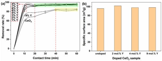 (a) Time dependence of AO7 removal rates in the presence of undoped and doped CeO2 with different Y amounts of 1, 2, 3, 4, 5, 6, 7, 8, and 9 mol.% and (b) specific surface areas of undoped, 2 mol.%, 4 mol.%, and 9 mol.% Y-doped CeO2.