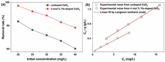 (a) Effects of the initial concentration of AO7 on its removal rate within 60 min of reaction, utilizing either undoped or 4 mol.% Y-doped CeO2 as the adsorbent, and (b) corresponding Langmuir linear fits.
