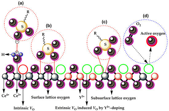 According to the analyses conducted via XPS in Figure 6, Raman scattering in Figure 7, and H2−TPR in Figure 8, it was evident that undoped CeO2 contained a significant number of intrinsic VO defects. The formation and filling of these vacancies were accompanied by the release and storage of oxygen atoms within the CeO2 lattice, leading to a substantial deviation from stoichiometry in the atmosphere. This resulted in the formation of nonstoichiometric oxide CeO2-δ, as expressed by Equation (2). During the synthesis of Y-doped CeO2, the primary phase component identified was cerium carbonate hydroxide (CeCO3OH) (JCPDS no. 52−0352), which was initially obtained through a solvothermal process. The Y compound either adhered to the surface of CeCO3OH or integrated into its lattice structure. Subsequently, calcination in the air at 500 °C facilitated not only the phase transformation from CeCO3OH to CeO2, but also enabled doping modification of the CeO2 lattice with Y ions, corroborated by our previous report [25]. Following doping with Y3+ cations, CeO2 maintained its fluorite crystal structure (refer to Figure 1 and Figure 5b), while concurrently resulting in the considerable generation of extrinsic VO defects, as indicated by the Kroger and Vink notations in Equation (3).