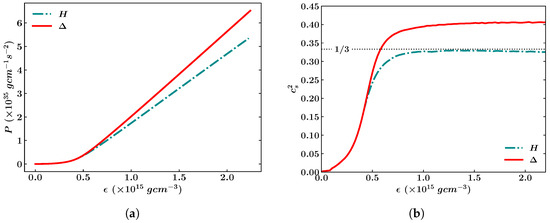 (a) Hyperonic (H) and delta () equations of state of the models considered and (b) the square of the speed of sound as a function of the energy density for the EoSs. The conformal limit is given by the dotted gray line.