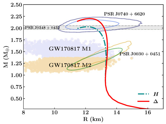 With the ever-growing observations of massive stars, the role of exotic matter such as quarks, hyperons, etc., in compact stars has become interesting and important, particularly since very little is known about nucleon–hyperon, hyperon–hyperon or delta’s interaction in matter. The observation of high-mass pulsars severely constrains the EoS and therefore the particle interactions, particularly when one considers exotics like hyperons or quarks in their inner shells. Their presence is known to have a softening effect on the EoS on one hand, while on the other hand we require a stiffer EoS in order to achieve a massive neutron star configuration. There are several prescriptions available in the literature to obtain high-mass stars; for example, one may consider the effect of repulsive hyperon–hyperon interactions [45,46] or repulsive hyperonic three-body forces [47,48,49] or even a phase transition to deconfined quark matter [50,51].