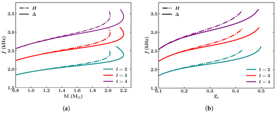 Next, we proceeded to calculate the f-mode oscillation frequencies using Cowling approximation as discussed in Section 3. We solved the differential equations given by Equations (7) and (8) and repeated the integration for different values of until the condition given in Equation (10) was satisfied. In Figure 3a, we show the plot of the f-mode frequencies as a function of the mass for the and 4 modes for both the H and EoSs. We found that the f-mode frequencies of the H and EoSs showed a noticeable change in the higher mass region (), while the mode frequencies were similar in the lower mass region. The mode frequencies () corresponding to the maximum mass for the H and baryon EoSs were and kHz. We found that was slightly decreased for the EoS. The values for for the H and EoSs were 2.94 (3.42) kHz and 2.98 (3.43) kHz, respectively. It is seen from Figure 3a that the f-mode frequencies of both the EoSs increased with the mass until it attained a certain value. The f-mode frequencies for and 4 for both H and lay approximately in the ranges of 1.84–2.42, 2.24–3 and 2.56–3.43 kHz, respectively, for a mass ranging from to the maximum mass profile. We found that the frequencies of the mode obtained for the EoS model lay within the range of mode frequencies obtained in Ref. [54] with different EoSs.