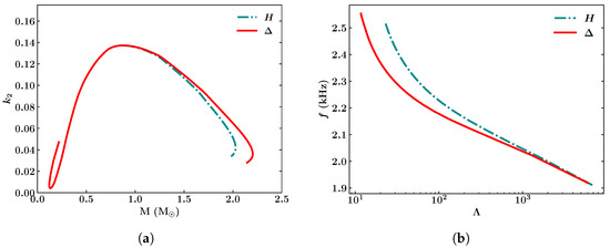 The tidal deformability provides key information about the neutron star matter. We calculated the dimensionless Love number () using Equation (14). In Figure 4a, we display a plot of versus the mass, M, of the stellar models considered. The value of remained the same for both of the EoSs considered until it attained a maximum value of , which had a corresponding mass value of ∼. Then, the value of decreased gradually and attained a value corresponding to the maximum mass () of and for the H and EoSs, respectively. The tidal deformability () could be obtained from the Love number and the stellar radius (R) using the relation . We plotted the f-mode frequencies as a function of for the models considered, displayed in Figure 4b. The f-mode frequencies as a function of for the H and EoSs were easily distinguishable, and in both cases the values decreased with an increase in the f-mode frequency until a certain value, and then they remained almost constant. The values of corresponding to the maximum mass for the H and EoSs were and , respectively. The event GW190814 set a limit on the canonical tidal deformability of [3]. The values of for the H and EoSs were around ∼800, which was in agreement with the constraint given by the GW event. Furthermore, in Ref. [28], the authors combined the constraints on the EoSs allowed by terrestrial nuclear experiments and tidal deformability data from GW170817. This gave them the limit for the f-mode frequency of a NS with as 1.67–2.18 kHz. We noted that the f-mode frequencies corresponding to a configuration for both the H and EoSs were approximately ∼2 kHz, which was in agreement with the given limit.