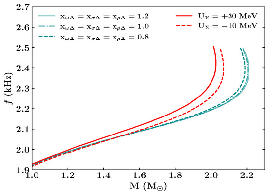 Next, we studied the f-mode oscillations by varying the potential depth for H models and the coupling constants for baryons. In Figure 5, we display the plot of the f-mode frequencies for the mode as a function of the NS mass for different parameterizations: MeV and MeV, and . We noted that the maximum mass increased when was decreased from to MeV. However, we found that the maximum mass showed only a negligible change when we varied the coupling constants of baryons. We found that the range of f-mode frequencies did not change when varying the values of the potential and delta coupling constants. The f-mode frequencies corresponding to the maximum mass () did not change considerably when either the potentials or coupling constants were varied.
