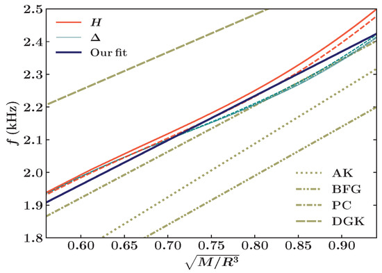 The fundamental idea behind gravitational wave asteroseismology is the same as that in traditional helioseismology, where stellar oscillations are studied to infer the properties of the interior of a star. Here, we proceeded to obtain a linear fit of the f-mode frequencies as a function of the average density, which was given as f (kHz) ≈ (here, and km) for our EoSs. In Ref. [73], the authors calculated the fitting relation using a polytropic EoS for the first time as f (kHz) ≈. This relation was later modified by the authors for relativistic EoSs [74] to f (kHz) ≈. Furthermore, in Ref. [75], the authors obtained empirical relations using hybrid EoSs. Recently, empirical relations using hyperonic and dark matter EoSs have been obtained in [23] and [25], respectively. We plotted the f-mode frequencies as a function of the average density for different parameterizations of the H and baryon models, shown in Figure 6. We also calculated a linear fit between the frequency and average density for the models considered, which was obtained as kHz + kHz. We compare the values of coefficients a and b obtained from different analyses in Table 2, and the fitting relations obtained are plotted in Figure 6. The empirical relations obtained in each case were different from one another, which was due to the difference in the composition of the matter considered inside the NS. We found that our data were closer to the fit obtained in Ref. [23]. The fitting relations can be used in order to constrain the EoS by measuring the f-mode frequency, which can be used to infer the mass and radius values.