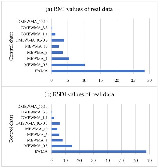 Additionally, Table 7’s summarized findings for each control chart are compared using the RMI and RSDI values, which were calculated so that the DMEWMA control chart’s RMI and RSDI values are lower than those of the EMMA and MEWMA at the same and . Furthermore, greater capacity and lower ARL and RMI values are shown by the DMEWMA control charts with large and values.