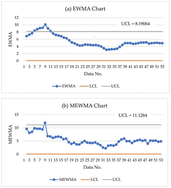 Control charts, also known as Shewhart charts, are fundamental tools in SPC that visualize how a process changes over time. They consist of data points representing a statistic from a process, plotted in chronological order, with three key components: a central line (average), an upper control limit (UCL), and a lower control limit (LCL) []. These charts are used to monitor process stability, detect out-of-control conditions, and investigate variations that may affect quality []. The Shewhart chart is a memoryless chart that only considers the most current process observations, ignoring any previous outcomes. In looking for modest fluctuations in process parameters, the cumulative sum (CUSUM) control chart recommended by Page [] and the exponentially weighted moving average (EWMA) control chart suggested by Roberts [] outperform the Shewhart-type control chart. Since then, numerous studies have been conducted to improve the performance of EWMA charts for minor process changes. For example, Shamma [] proposed double exponentially weighted moving average (DEWMA); adaptive exponentially weighted moving average (AEWMA) was introduced by Capizzi and Masarotto []; Zhou et al. developed the weighted exponentially weighted moving average (WEWMA) chart for identifying changes in a Poisson incidence rate []; Patel and Divecha suggested the modified exponentially weighted moving average (MEWMA) []; and Naveed et al. devised extended exponentially weighted moving average (EEWMA) []. Alevizakos et al. proposed a triple exponentially weighted moving average (TEWMA), a hybrid of EWMA in 2021, and reported that it was more efficient than the EWMA control chart []. They also proposed a double-modified exponentially weighted moving average (DMEWMA), which is a hybrid of the two MEWMA control charts [].