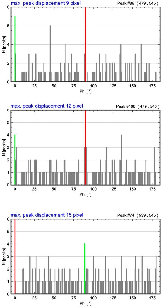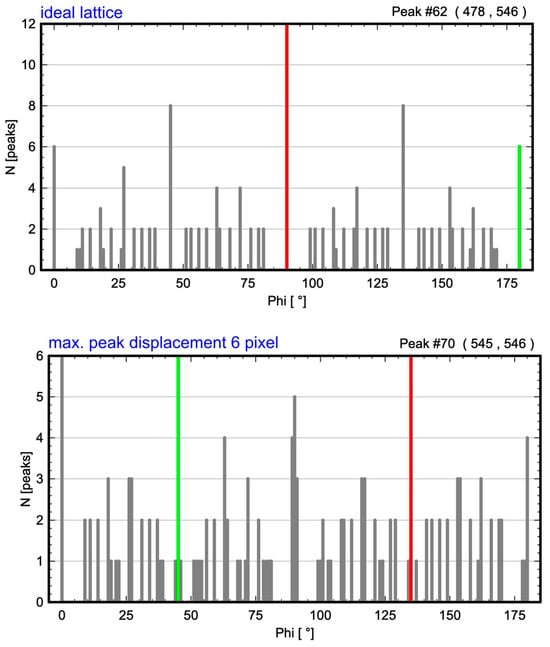 As proved by the analysis of the 2D point lattices listed in Table 1, the investigated approach can identify and retrieve the underlying motif (2D unit cell) of simple structures when the atom peaks are located on a regular lattice. To check whether this approach is robust enough to also work on distorted and more complex structures, the following test scenario was established. For this, the JEMS program [www.jems-swiss.ch (accessed on 2 November 2024)] was employed to calculate [001]-projected potential maps for disordered and perfect ordered ideal cubic barium titanate, BaTiO3 [], which then served as surrogates for HAADF images. For the distorted structures, all projected atom peaks were allowed to relocate randomly in-plane from their original positions between 6 and 15 pixels, which corresponds to atom peak displacements between 0.36 and 0.89 Å, respectively (Table 2). For calculating the ALPD plots, only the strongest peaks, which refer to the projected barium atoms, were considered since they are located on the edges of the undistorted projected 3D unit cell in the B-type setting of perovskite structures []. The selection of the strong peaks for the analysis was achieved by using the peak intensity discriminator function mentioned in Section 2.2. Moreover, in the search for the second-strongest peak in the ALPD plots, the program was advised to select only those that yield the cell angle closest to 90°. This constraint was applied to obtain comparable results and to avoid other solutions with larger or smaller cell angles. The within this test are shown in Figure 15, and the processed pseudo-HAADF images with the maximum populated lattice directions used for calculating the cell angles in Table 2 are shown in Figure 16.