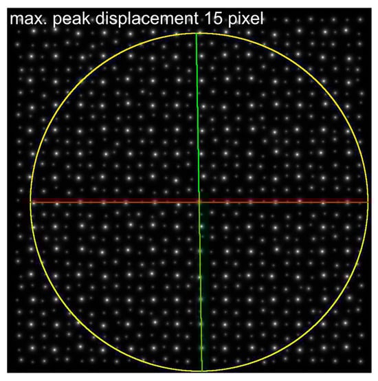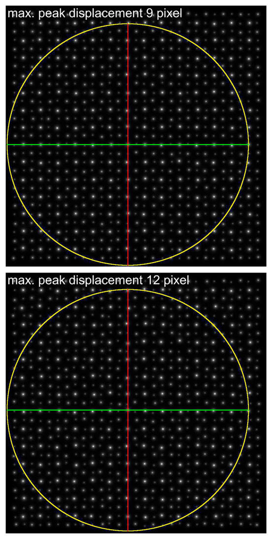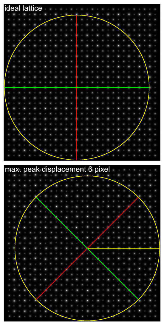 Projected potential maps of BaTiO3 with increasing in-plane atom peak displacements used for calculating the ALPD plots in Figure 15. The superimposed yellow circle marks the maximum considered distance of atom peaks to the center peak. The red and the green lines are the lines with the maximum population when the expected 2D unit cell angle is allowed to vary between 85° and 95°, and only the strong barium peaks are analyzed.
