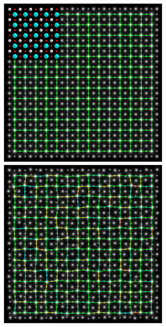 As mentioned in Section 1, the task of determining the 2D unit cell dimensions and atom positions from HR(S)TEM images of inorganic materials can be easily achieved by using Fourier transforms and crystallographic image processing (CIP) [,,]. For benchmarking purposes, the pseudo-HAADF images of ideal and disordered BaTiO3, with a maximum peak displacement of 12 pixels (0.71 Å), were analyzed by both methods. Crystallographic processing of the pseudo-HAADF images in Figure 17 was performed using CRISP version 2.2 from Calidris []. The results of this processing are summarized in Figure 18. Figure 19 shows the corresponding results obtained using ALPD plots on the same images.