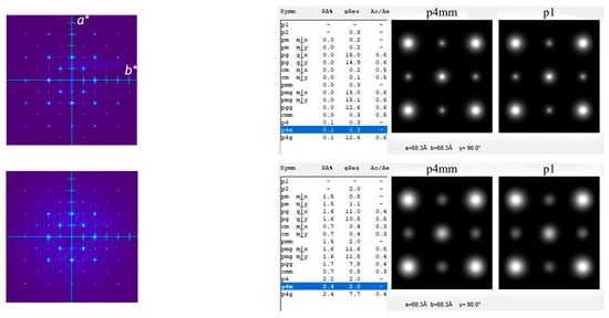 Crystallographic image processing of the ideal (top) and disordered projected potential maps (bottom) of the pseudo-HAADF images of BaTiO3 in Figure 17 with the program CRISP []. As shown by the averaged maps on the right, both the p1 and phase-corrected p4mm maps yield essentially the same size and geometry of the 2D unit cell for the ideal and disordered lattices ( = = 68.3 pixels 4.05 Å, = 90°). The random displacement of atom peaks is, however, responsible for the slightly larger residuals for the amplitudes (RA%) and phases (φRes), the less sharp atom peaks in the averaged maps and the visible loss in resolution in the Fourier transforms on the left. Moreover, the introduced disorder generates some diffuse background with a few additional peaks between the maxima of the ideal reciprocal lattice.