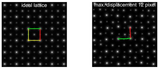 Results from processing the pseudo-HAADF images of BaTiO3 in Figure 17 using ALPD plots. Even though a 90° rectangular lattice was clearly detected for both cases in the first step of the analysis (see Table 2 and Figure 16), a complete unit cell could only be recovered for the ideal periodic lattice on the left. The 2D unit cell dimensions determined from the nearest peak positions to the analyzed central atom (=cell origin) for the ideal structure are (red) = (green) = 68 pixels 4.03 Å, = 90 °. The determined principal axes for the disordered structure with allowed peak displacements of up to 12 pixels (0.71 Å) are (red) = 64 pixels 3.80 Å, (green) = 70 pixels 4.15 Å and = 90.7°.