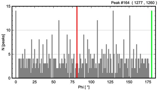 The analysis of the other 2D lattices listed in Table 1 is consistent with the result obtained for the oblique lattice: i.e., the angles related to the main cell axes are characterized by pronounced maxima with empty regions with zero counts on either side (see Figure 6, Figure 8, Figure 10 and Figure 12). In all cases, the maxima corresponding to the principal axes are found among the two strongest peaks with the highest atom population density of the lattice (Figure 4, Figure 6, Figure 8, Figure 10 and Figure 12). It should be emphasized that the unit cell angles derived from the two strongest maxima yield valid primitive unit cells in all cases, which can be used as a basic motif to represent the entire periodic lattice of the 2D structure. However, the unit cells derived from the two strongest maxima do not necessarily conform to the crystallographic rules for choosing a unit cell, i.e., the requirement for 90° cell angles for the rectangular and square lattices and a 120° cell angle for the hexagonal lattice type [,]. In order to comply with these rules, the mechanism for selecting the second maximum for the cell angle determination needs to be managed. For the automatic mode of the developed program, introducing the restriction to skip the second-largest maximum if the angle difference is less than 85° degrees was sufficient to arrive at the (crystallographically) correct 2D unit cell for the rectangular C-centered lattice (Figure 7 and Figure 8), the hexagonal P lattice (Figure 9 and Figure 10) and the square P lattice (Figure 11 and Figure 12). Despite this formal drawback, which can easily be fixed by imposing angular constraints, the tests performed for the five possible 2D lattice symmetries demonstrate that the 2D unit cell can be quickly and reliably retrieved by calculating the ALPD plot for any single-atom peak in a periodic monoatomic lattice.