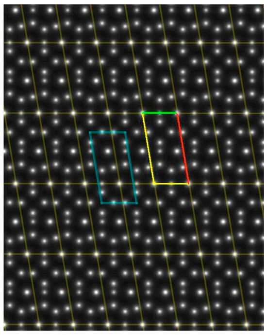 A pseudo-HAADF image of trigonal Nb7Co6 [] projected along the [110] direction. The unit cell and periodicity determined by the ALPD approach in this study and the corresponding unit cell obtained by Alhassan and co-workers [] are shown as an overlay. As can be seen, both unit cells match in size and orientation and represent legal 2D unit cells for this projection. The ALPD cell, determined from the peak positions around the cell origin, has the dimensions (red) = 173.3 pixels, (green) = 84 pixels, = 99.3°.