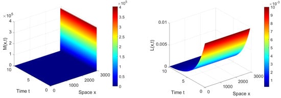 Firstly, We substitute this expression for into the first and third equations of the original system. For example, substituting into Equation (1), we get a new equation in terms of M and L only (after substituting ). Similarly, substituting into Equation (3), we get another equation in terms of M and L. Then, by combining Equations (4) and (5) and substituting , we derive new expressions for and at . We now have a system of two equations in two variables (M and L). We can study the existence of the solution to this reduced system, as follows: