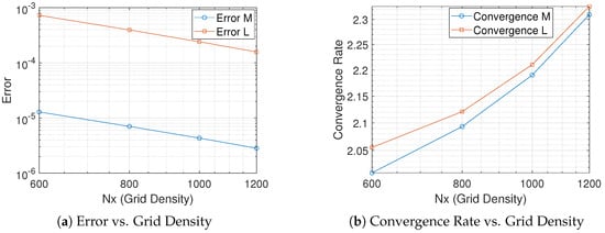 From Table 1 and its visualized results in Figure 4, it can be observed that the quasi-steady-state approximate model demonstrates favorable numerical properties under the finite difference method, including error reduction, improved convergence, and stable computational efficiency. As the grid density increases, the accuracy of the numerical solution improves, reflecting that higher-resolution grids can better capture the variations of the variables and in the model, thereby reducing numerical errors. This indicates that the finite difference method provides accurate numerical solutions and exhibits high applicability and reliability in solving such problems. In terms of convergence, the visual results show that, as the grid density increases, the convergence rate of the model gradually stabilizes, approaching the theoretical second-order accuracy. This convergence behavior is a key characteristic of the finite difference method, demonstrating that the numerical results are not only accurate but also that the numerical method is well-designed, allowing the solution to reliably approach the exact solution as the grid is refined. Furthermore, from an overall trend perspective, although the accuracy and convergence improve with increasing grid density, this improvement comes at the cost of increased computational effort. As the grid becomes finer, the time required for numerical computation increases, which reflects the trade-off between accuracy and computational cost commonly seen in the finite difference method. To address these limitations in computational efficiency, potential improvements can be explored. For example, adaptive mesh refinement techniques can dynamically allocate computational resources to areas with high variability, optimizing the balance between computational cost and accuracy. Additionally, leveraging modern computational techniques, such as parallel computing or GPU acceleration, could significantly reduce computation time while maintaining numerical precision. These methods provide feasible strategies to improve computational efficiency, particularly for scenarios requiring high-resolution and precise solutions.