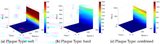Clinically, plaques are classified into stable plaques (also referred to as “hard plaques”) and unstable plaques (also referred to as “soft plaques”). As shown in Table 3, the reaction rate and diffusion speed in the quasi-steady-state approximate model were adjusted based on the different plaque types. In soft plaques, pro-inflammatory macrophage activity is high and local inflammation is significant, reflected in the model as a higher reaction rate. In mixed plaques, pro-inflammatory macrophage activity and local inflammation are moderate, leading to a moderate reaction rate in the model. In hard plaques, pro-inflammatory macrophage activity is low and local inflammation is minimal, resulting in a lower reaction rate in the model.